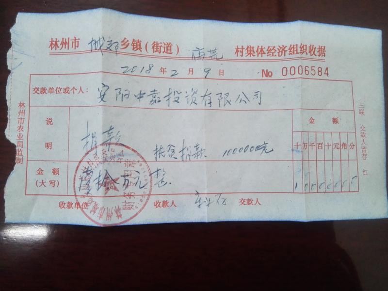 2018年2月10日上午,受公司董事长付刚委托,魏总和企管部负责人等一行,到林州市城郊乡庙荒村开展"扶贫"活动, 在庙荒村党支部书记兼村主任郁林英、第一书记陈军的陪同下,走访慰问村民, 详细了解贫困户的生产、生活、健康以及脱贫情况,鼓励他们要坚定信心,在党和政府的关怀下,一定能够早日脱贫,过上更好的生活。魏总代表公司向庙荒村捐款十万元人民币,村民对企业的关怀纷纷表示感谢。